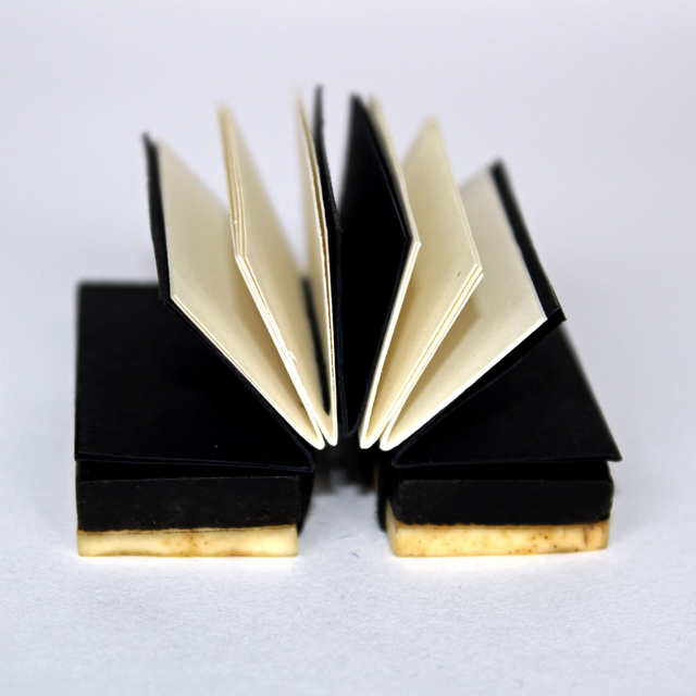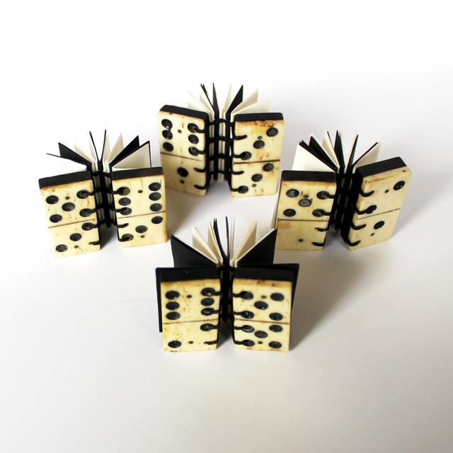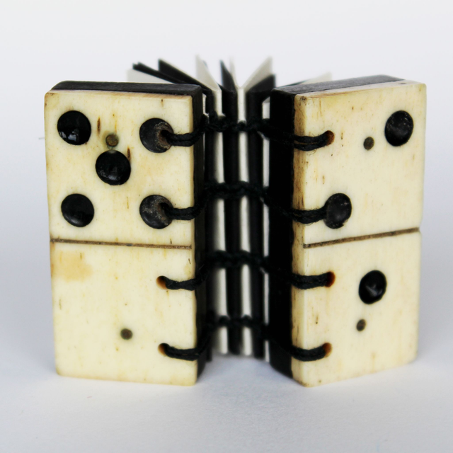 Each book uses two tiny, vintage, bone and ebony dominoes.