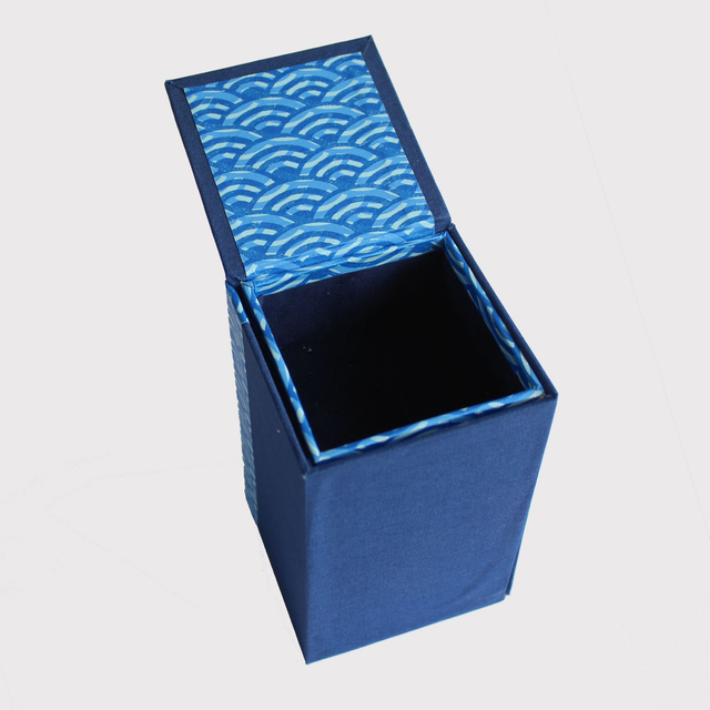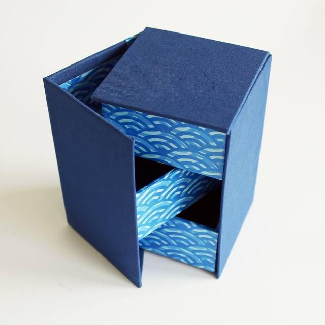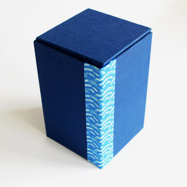 This box is constructed from thick card and covered with my own hand printed paper and matching blue book cloth.