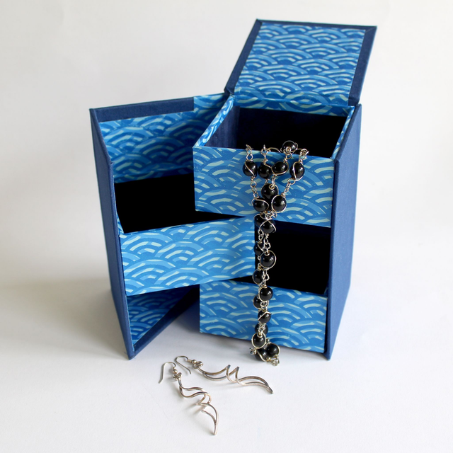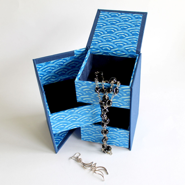 The box opens diagonally revealing the three trays in which to place jewellery or other small items. The top closes down over the top box.