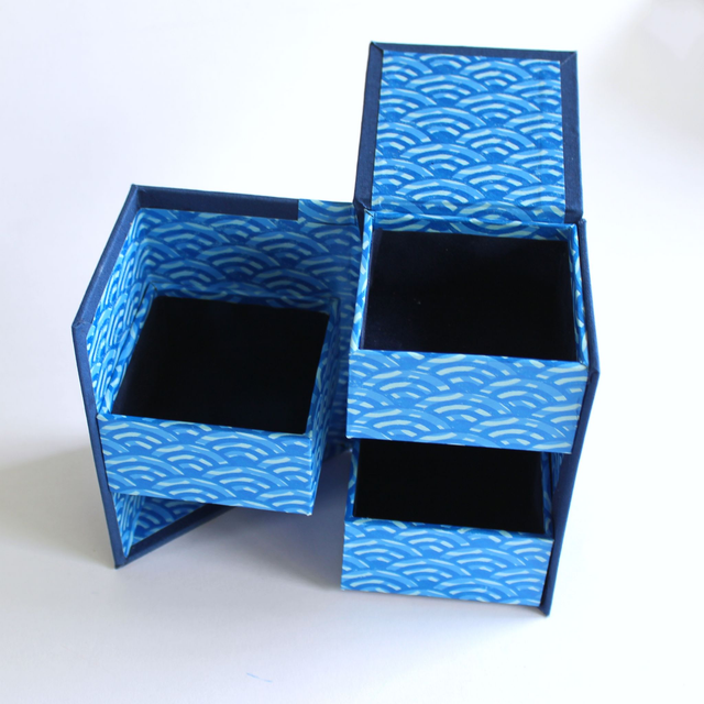 Each tray is 4cm deep and lined with dark blue velour textured paper.