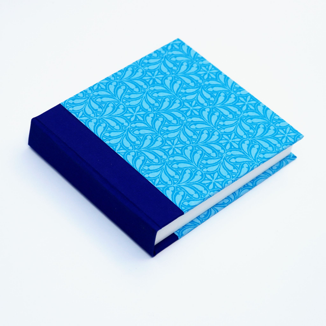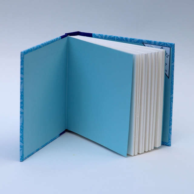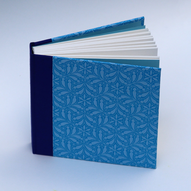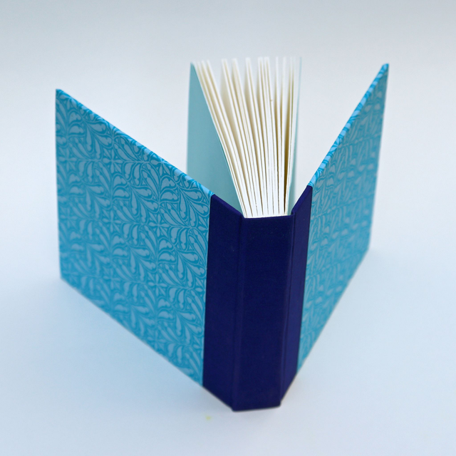 Hand stitched and bound sketchbook with a blue, book cloth spine .